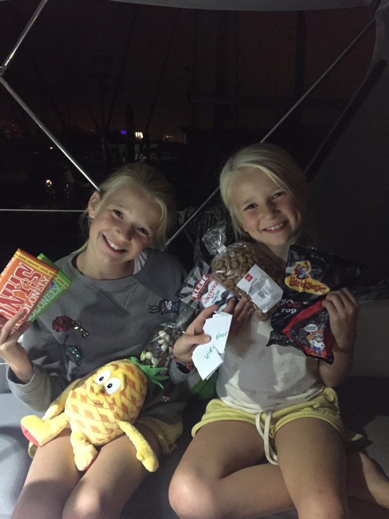 Hij heeft een goodie back uit Nederland meegenomen van de vriendinnen van Mirjam. We drinken wat aan boord en hebben het over mooie zeereizen.