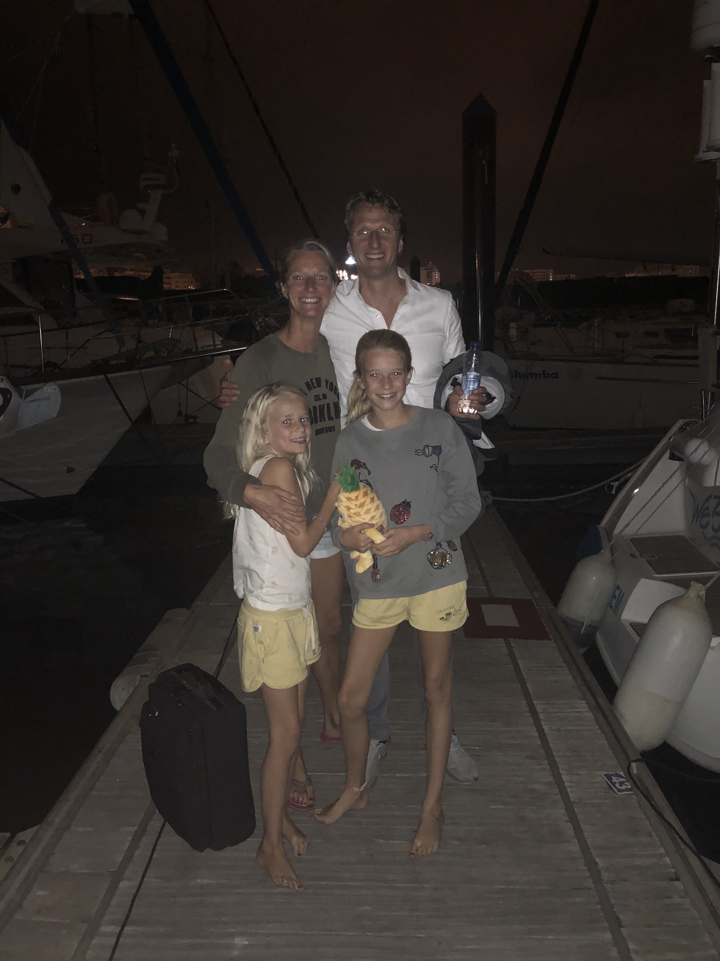 Eindelijk is Kornelis gearriveerd en samen lopen we naar de haven toe. Daar wordt hij hartelijk ontvangen door de meiden.
