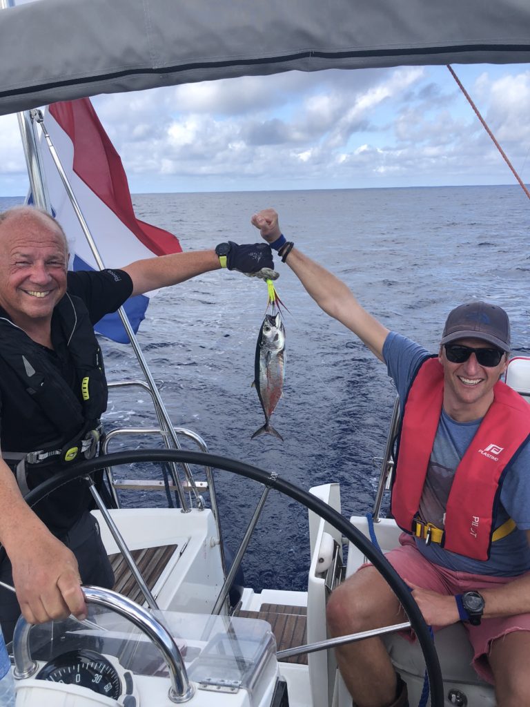 Na een paar minuten heeft hij beet. Hij haalt de lijn binnen en er zit een prachtige blauwvin tonijn aan. We halen de tonijn binnen en fileren hem voor de sashimi. Mirjam en de meisjes kijken op een afstandje gespannen maar ook nieuwsgierig toe. Na een dag besterven in de koelkast eten we de rauwe tonijn op, maar constateren dat het toch niet zo lekker smaakt als verwacht. Misschien omdat we hem zelf hebben gedood, misschien omdat we wat katterig zijn, geen idee.
