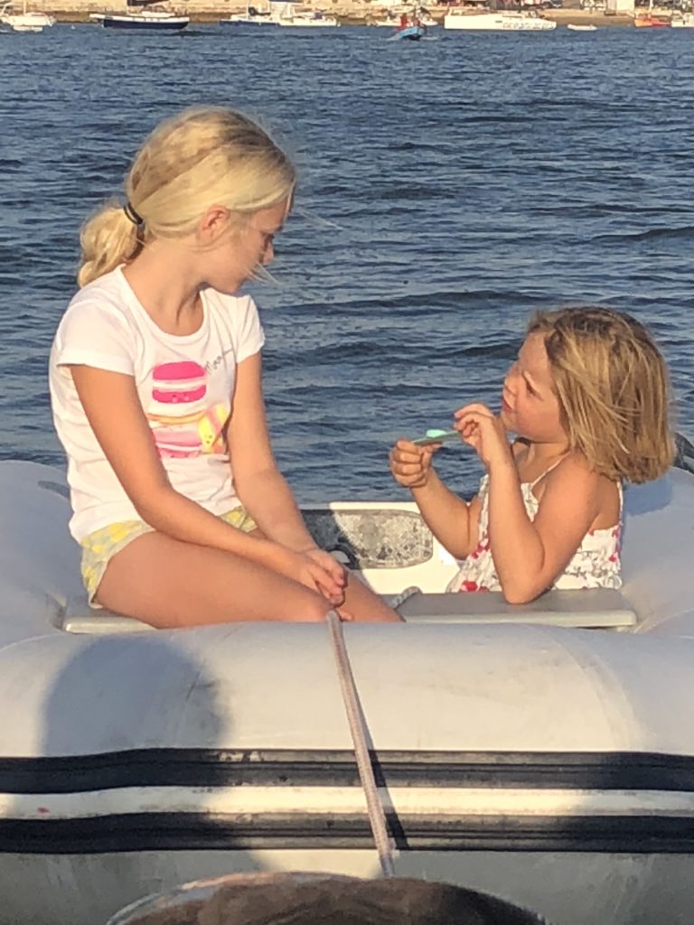 De woordenschat van Kiki en Noor groeit met de dag. Het wordt snel donker hier in het zuiden van Europa en op de tast pakken we alle spullen weer in en varen naar de boot toe.