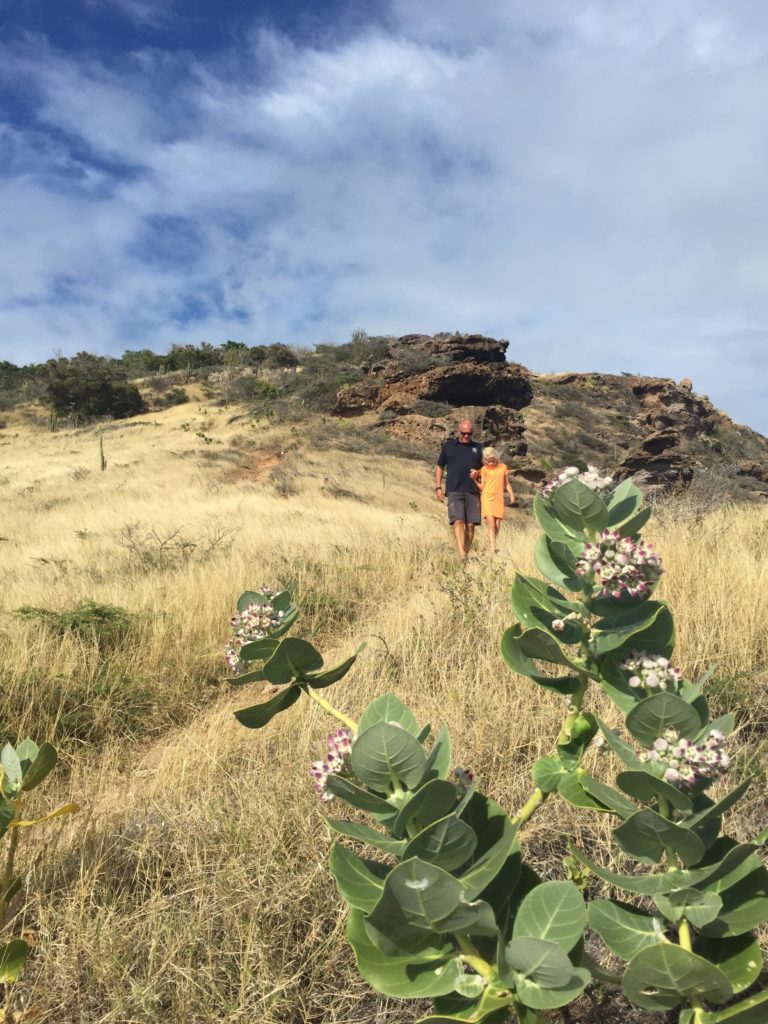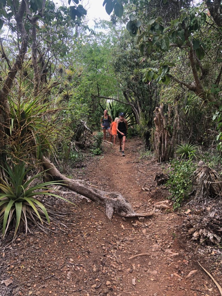 De volgende ochtend maken we een lange wandeling naar Shirley Heights. Dat is het voormalige militaire complex boven op de berg bij de ingang van de baai. Een strategische plek voor de Engelsen om alles in de gaten te houden. In plaats van de gewone weg, nemen we een trail naar boven.
