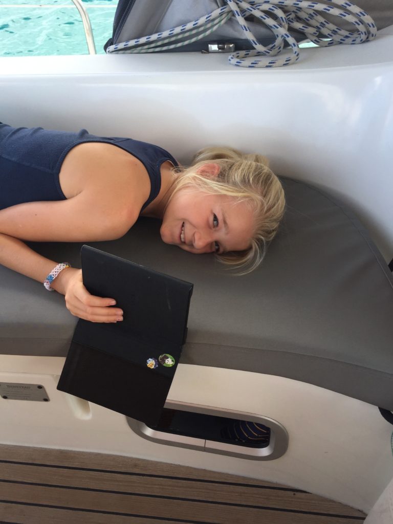 De volgende ochtend na het ontbijt slaan de meiden weer aan het rekenen en taal. Opeens hoor ik iemand ‘hallo’ roepen en ga naar buiten en zie twee koppies in het water. Het zijn onze Nederlandse buren Thijs en Wilma van Luna Verde die iets verderop voor anker liggen. We hebben ze al eerder gezien op Lanzarote, waar we aan dezelfde steiger lagen. Ze vragen hoe het met ons gaat en we maken een praatje terwijl ze de hele tijd in het water blijven. Uiteraard hebben we ze aan boord gevraagd maar ze wilden graag in het water blijven. Heerlijk verfrissend.