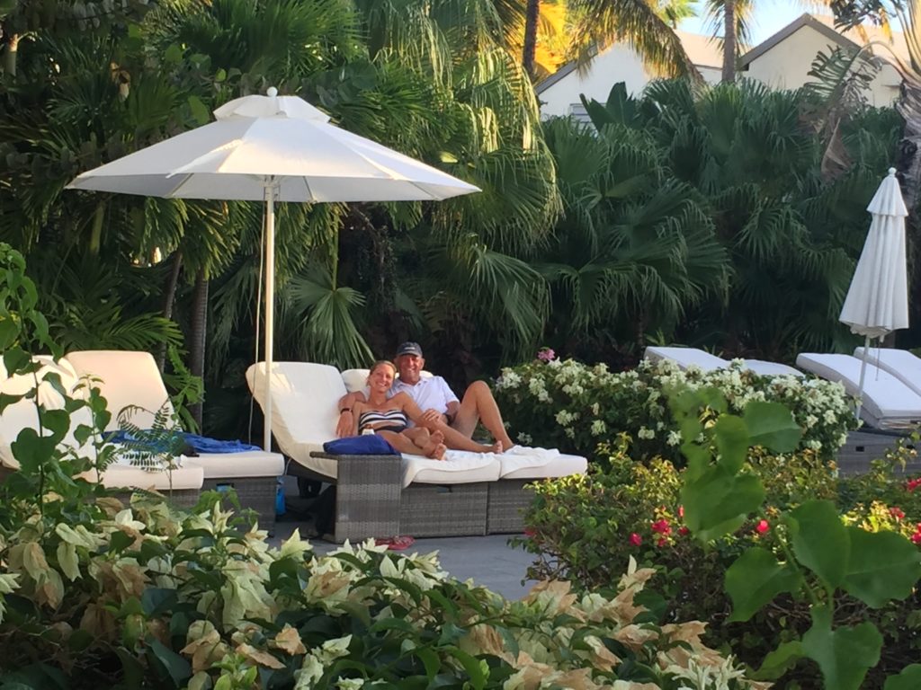 Het is inderdaad een mooie baai en de wind staat gelukkig gunstig. We varen zo ver mogelijk door en zoeken een goede plek om te ankeren. Mirjam staat dan voor op de punt en zoekt naar een plek waar alleen zand is en zo min mogelijk zeegras of rostsen. Ze wijst mij dan de weg daar naar toe en dan laten we precies op die plek het anker zakken. Het is al avond en we besluiten om aan boord te blijven. De volgende ochtend gaan we aan land en gaan we de boel verkennen. Mirjam pakt de sup en peddelt langs de rotsen op zoek naar een mooie snorkelplek. Later op de dag gaan we naar de kant en lopen we over het resort. Het is een prachtig resort met…. een groot zwembad. We zoeken een mooi plekje onder een parasol op een ligbed. Direct komt iemand naar ons toe met een koeler met flesjes water. Ze maken ook de bedjes voor ons op met handdoeken. Daarna plonsen we in het koude water en douchen af met een warme douche. Wat een weldaad.