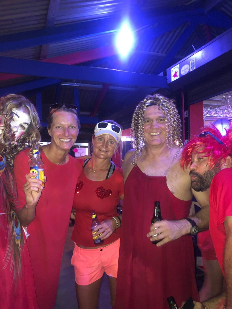 In de tussentijd gaan Kiki, Noor en ik naar het zwembad van een luxe resort en zien vanaf onze luie stoel de een na de andere rode jurk aan de overkant van het water rennen. Na de run worden alle nieuwe renners gedoopt en drinken als ontgroening een glas bier tot op de bodem leeg. Prachtig initiatief met een goed doel!
