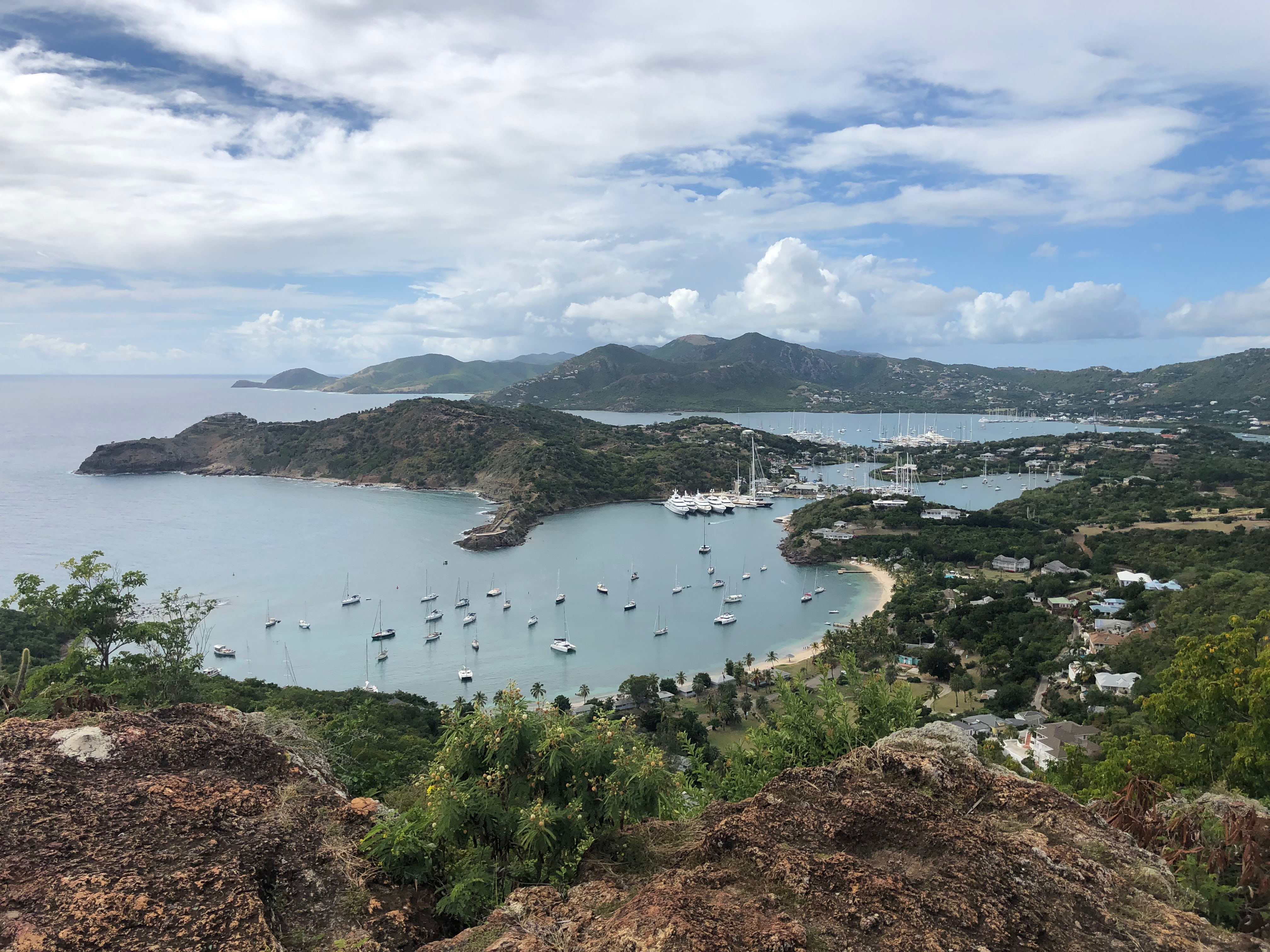 De volgende ochtend maken we een lange wandeling naar Shirley Heights. Dat is het voormalige militaire complex boven op de berg bij de ingang van de baai. Een strategische plek voor de Engelsen om alles in de gaten te houden. In plaats van de gewone weg, nemen we een trail naar boven.