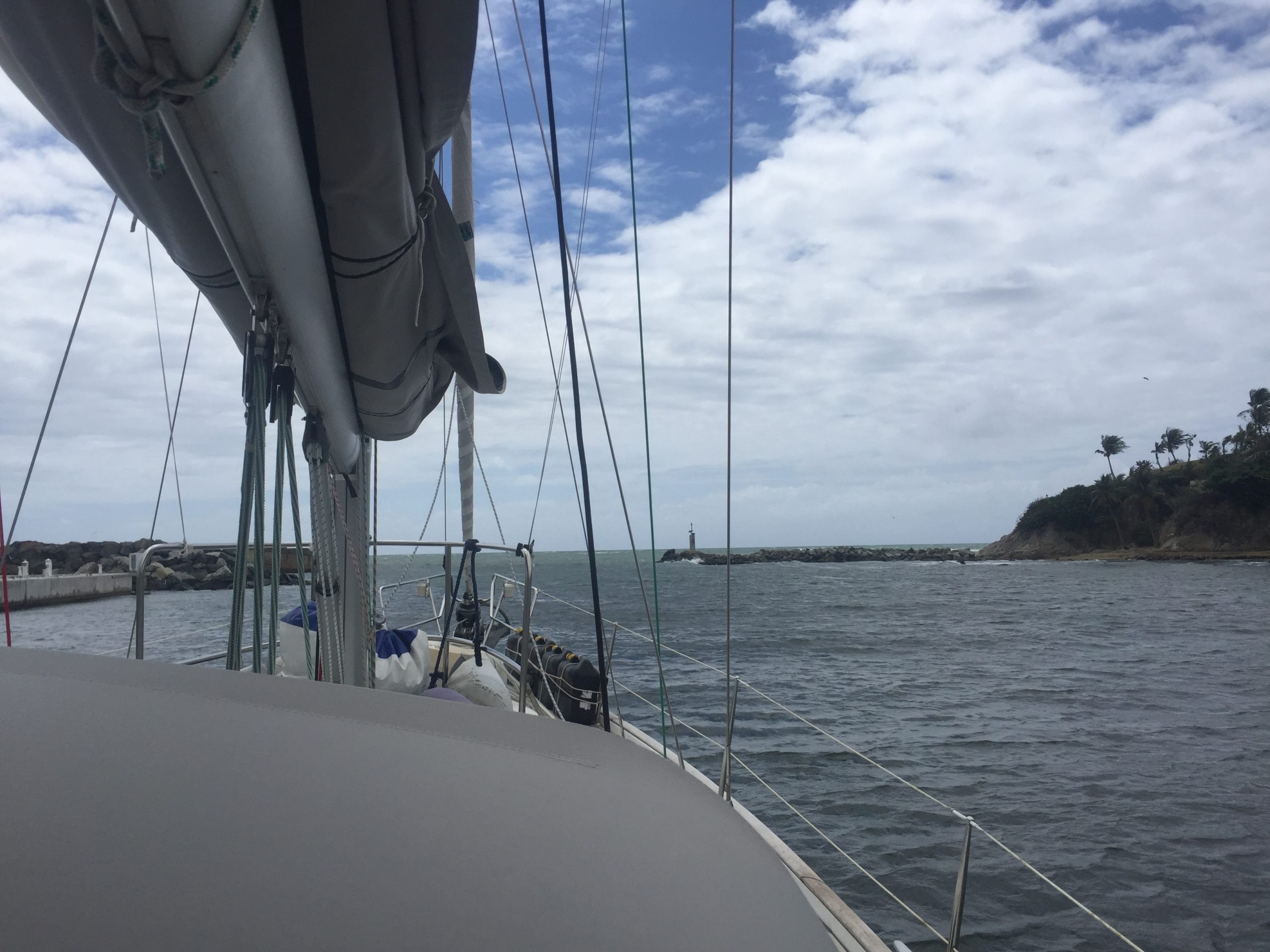 Ons vertrek staat gepland voor de ochtend maar het waait zo hard en we zitten op lager wal waardoor we besluiten om het vertrek even uit te stellen tot na de ergste buien. We moeten het eerste stuk tegen de wind opboksen richting Fajardo waar Gepetho op ons wacht. Rond 10 uur neemt de wind iets af en een half uur later gooien we de trossen los. Een memorabel moment omdat dit echt onze terugreis betekent. We verlaten de Carieb om naar huis te varen. Ook al zal die tocht naar huis nog zo’n drie maanden gaan duren, het voelt als naar huis gaan. We varen tussen de havenhoofden door en krijgen direct al te maken met een flinke deining.