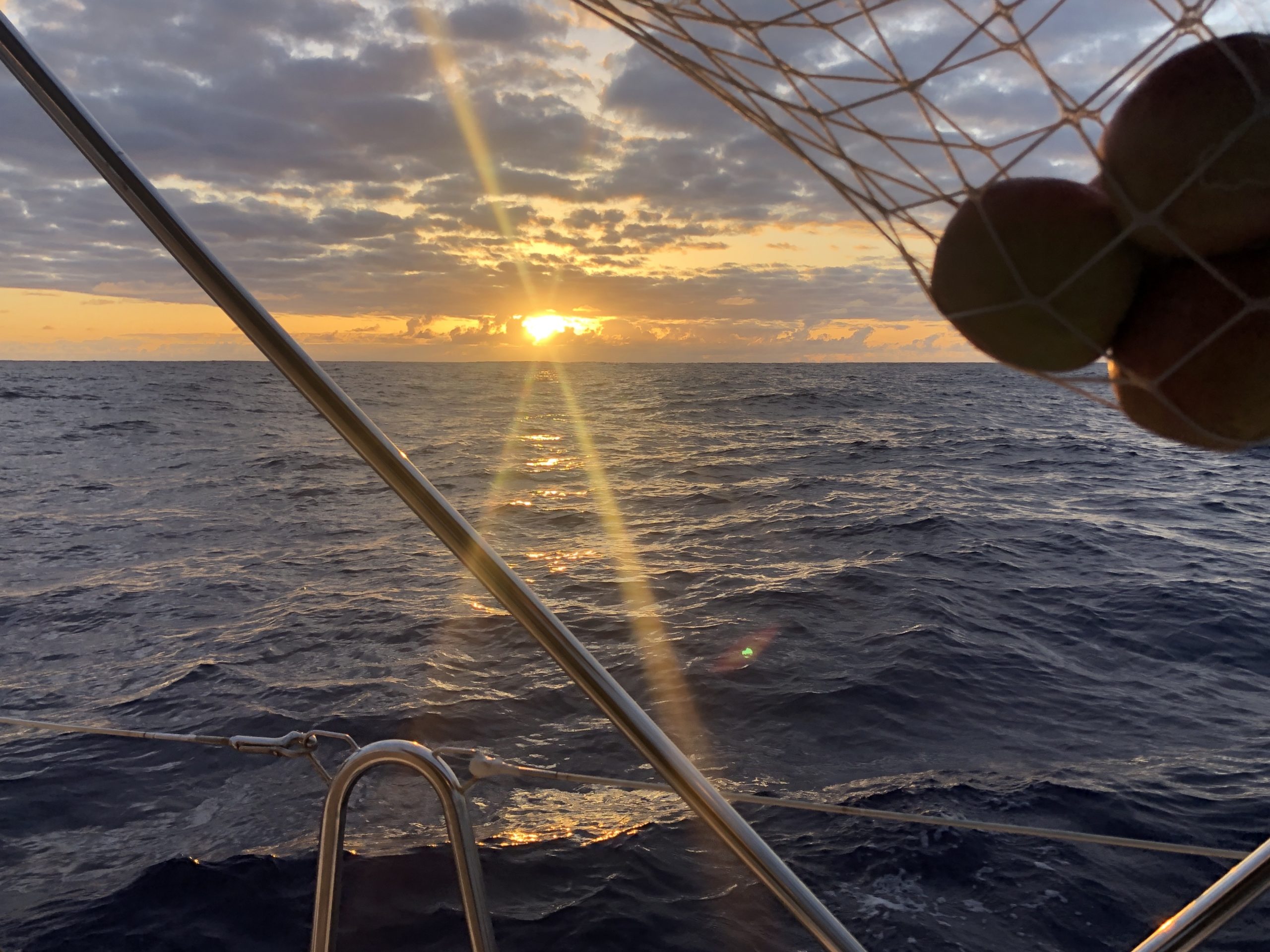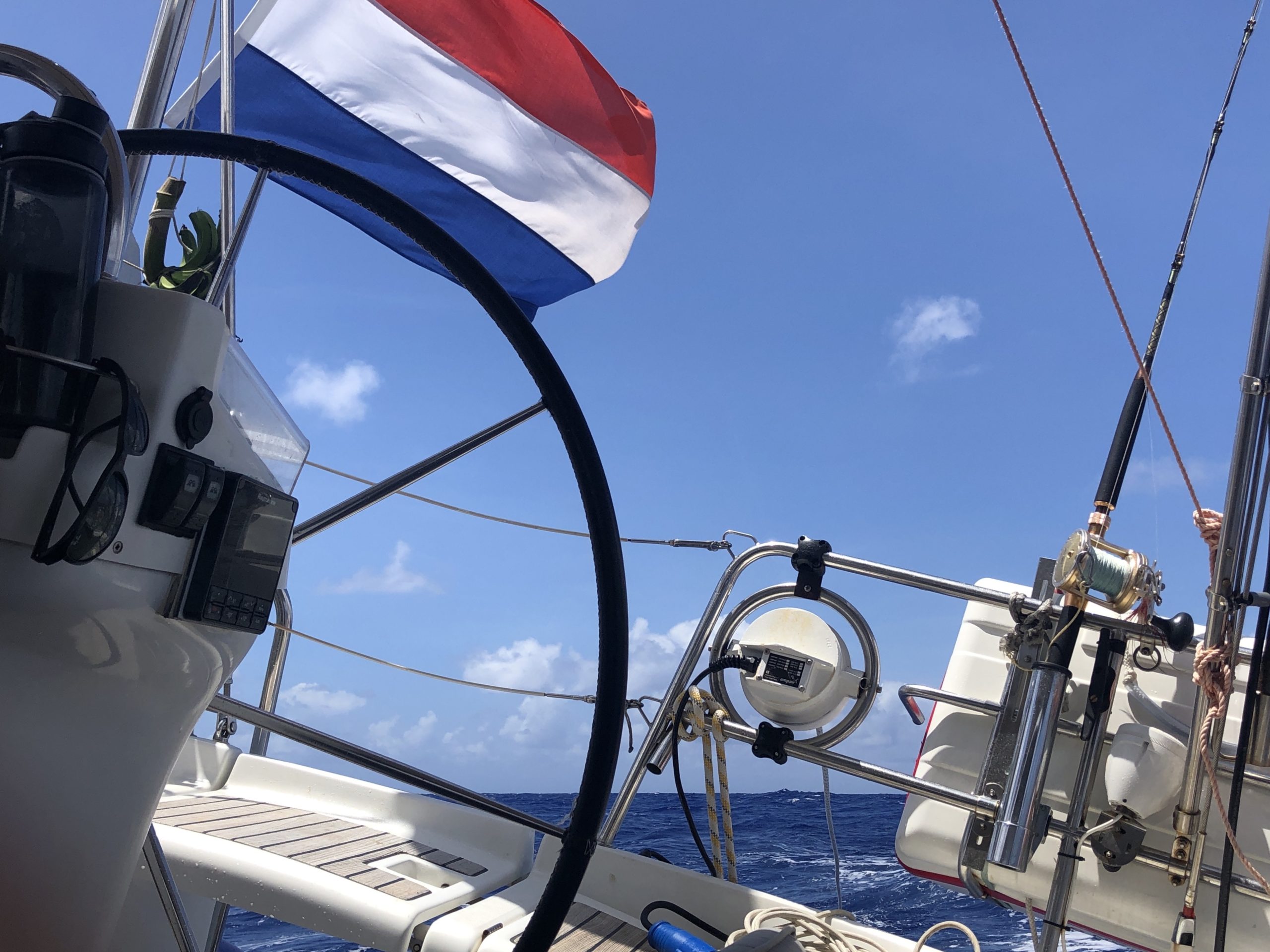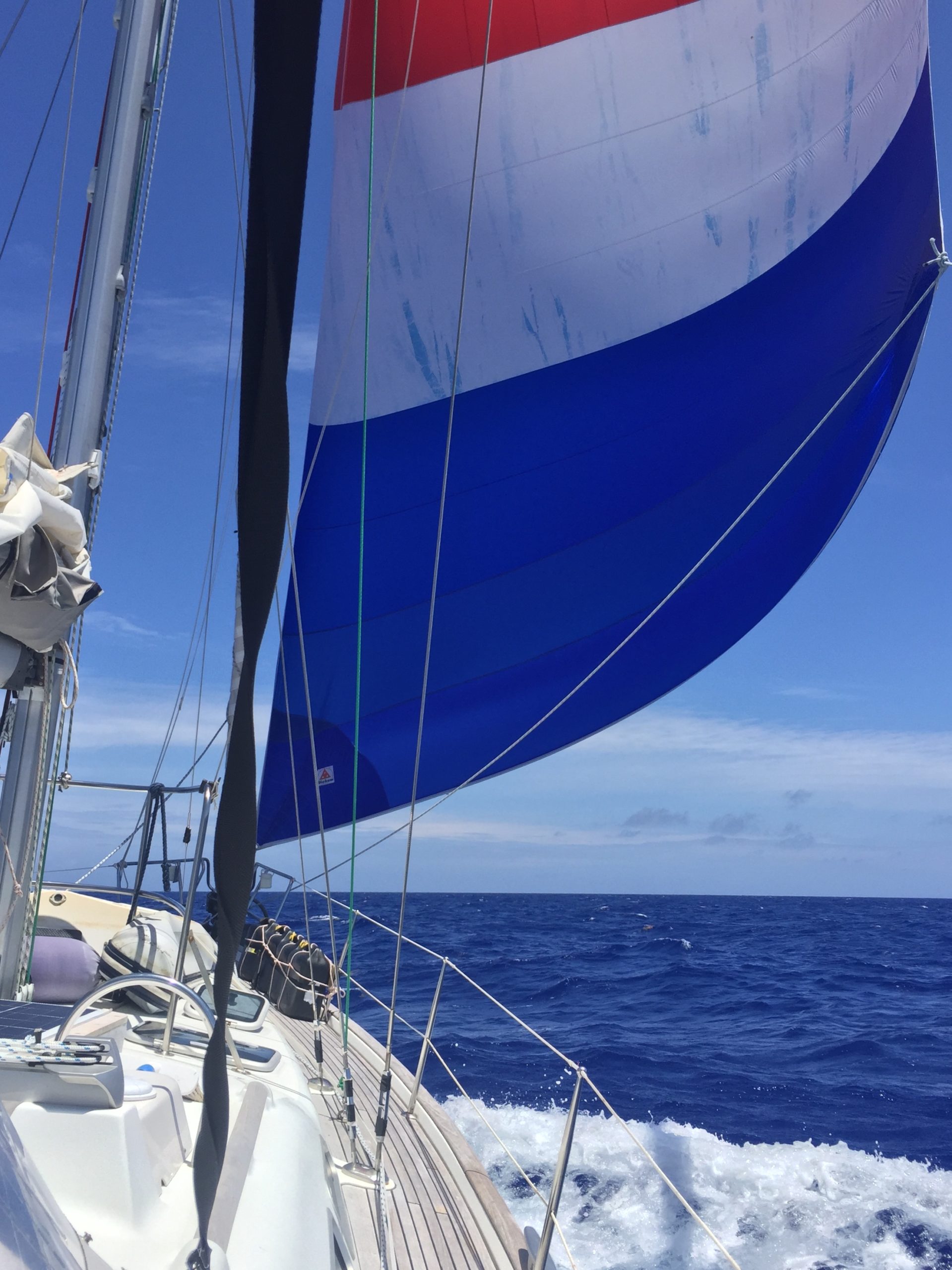 We zijn nu vier dagen onderweg en halverwege. We varen nu echt in de Bermudadriehoek. Gelukkig hebben we na dagen tegenwind, weer even de wind in de rug en hijsen de Genaker. We voelen meteen weer dat er vaart in de boot komt. Het weer is kalm, lekker windje en af en toe zon, soms een buitje maar overwegend is het droog en prima te doen. Wat nou bijgeloof, het gaat prima zo. Aan het eind van de middag verleggen we de koers iets omdat de wind weer begint te draaien en we zo lang mogelijk met de genaker willen zeilen. We moeten dan wel eerst gijpen. dan gaat het zeilvan voor de wind naar voor de wind over de andere boeg. De wind komt van achter en je zorgt dan dat het zeil dan van bakboord naar de stuurboord zijde van de boot gaat. Dat is nog wel een manoeuvre waar je met zijn tweeën even de aandacht bij moet hebben. Ik ga achter het roer staan en Mirjam bedient de lieren. Terwijl we deze manoeuvre uitvoeren, word ik draaierig en licht in mijn hoofd. Om te voorkomen dat ik onderuit ga, ga ik achter het roer zitten en een moment lang is het helemaal wazig.