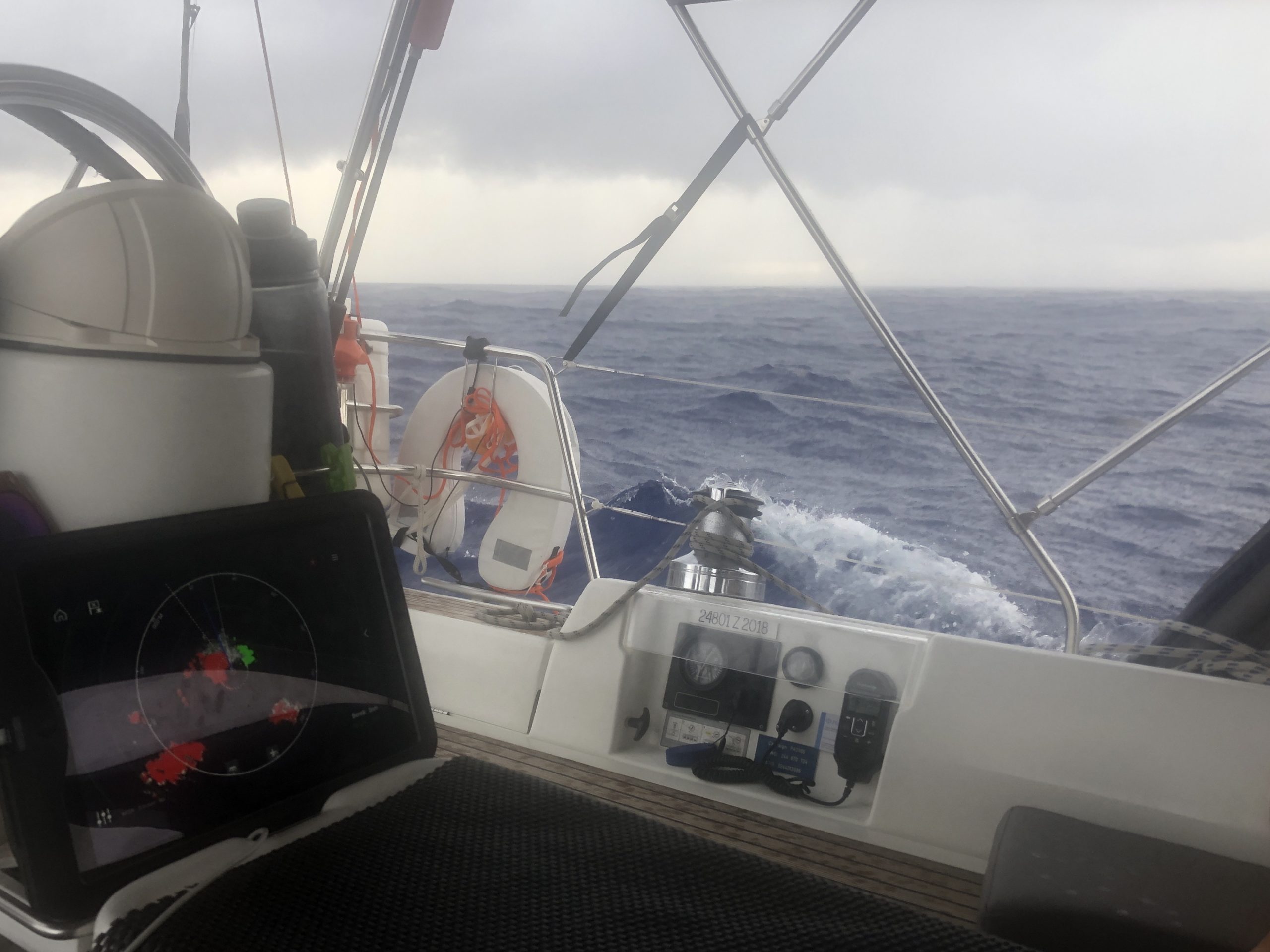 Toch lukt het om aardig de vaart erin te houden. Je merkt wel dat het ander weer begint te worden. Het wordt frisser en het heerlijke zonnetje wordt regelmatig afgewisseld met een flinke regenbui. Met een matig windje varen we richting Bermuda. Het gemiddelde begint op te lopen en dank zij Mirjam, die de mast in is geklommen en boven in de mast de vallen goed heeft gedaan, kunnen we met een gerust hart de gennaker voeren, zonder dat de vallen doorslijten.