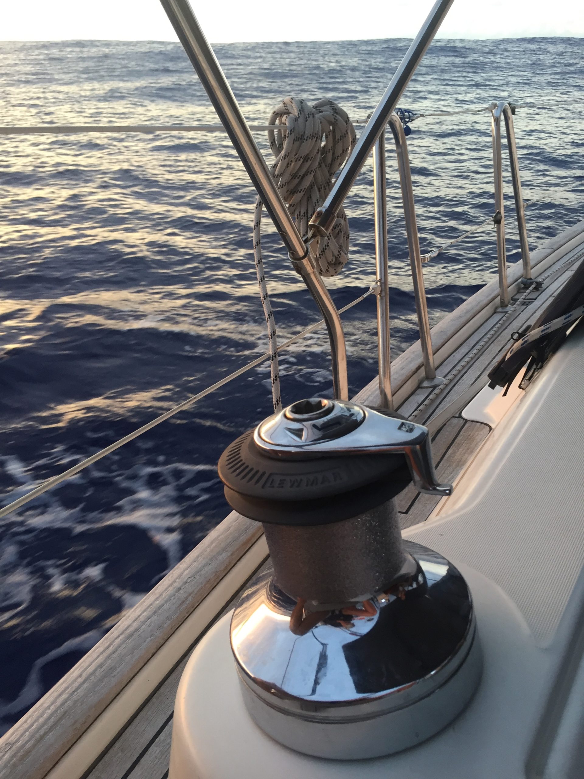 Na enkele uren varen, merken we dat we langzamerhand in dieper water komen omdat de golven minder steil en langer worden. Dat geeft rust. Het wordt avond en we zien de lichtjes van San Juan in de verte langzaam verdwijnen in de donkere nacht. Om de beurt nemen we een shift van ongeveer drie uur. Het is rustig weer en dat is wel lekker om de tijd te krijgen om in te slingeren.