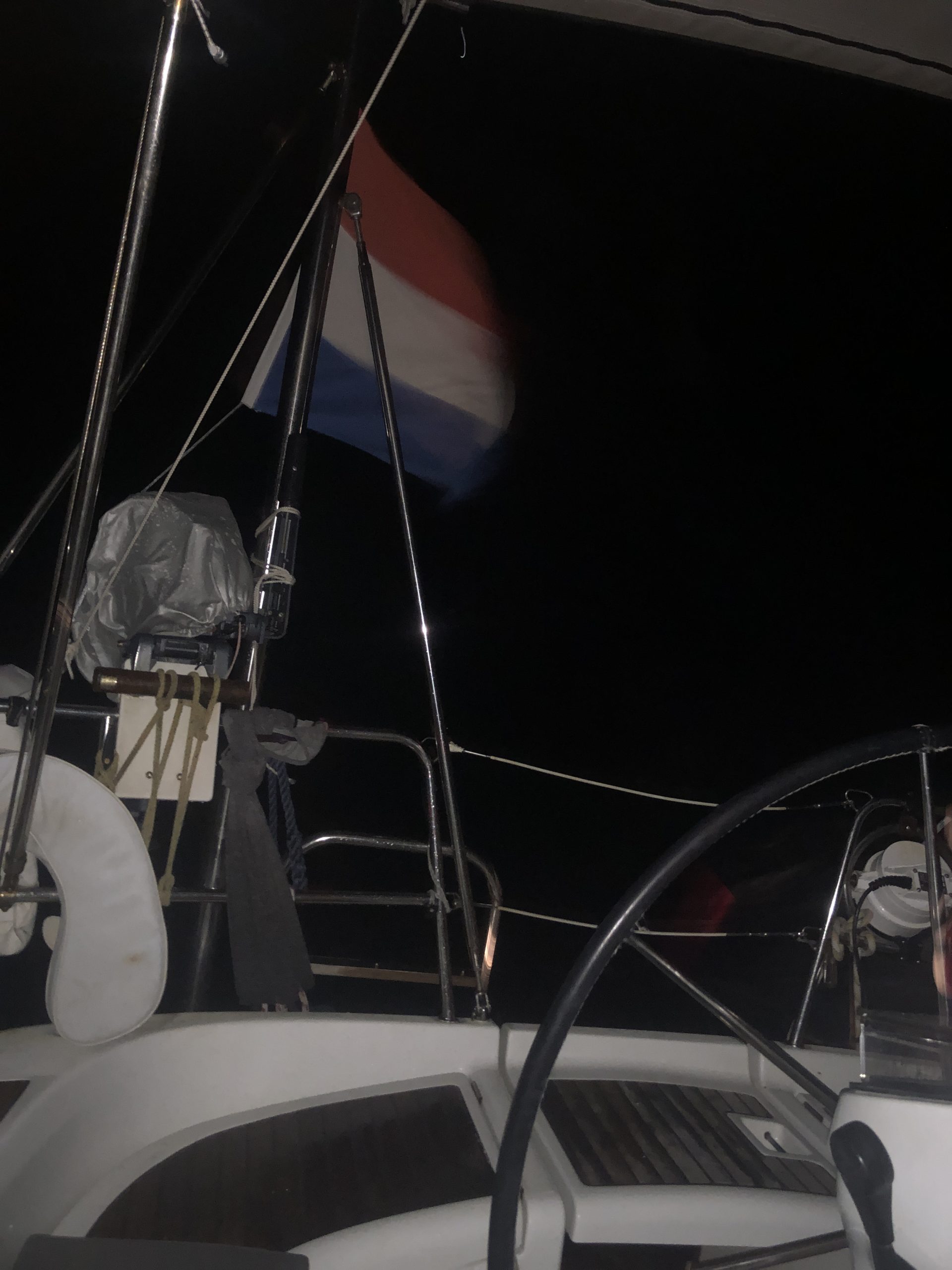 Ondertussen wordt het avond en ik neem de eerste shift. Mirjam gaat slapen en alles is in rust. Ik zit relaxed in de kuip en heb wat muziek opstaan. Opeens staat Mirjam met grote schrikogen voor mij. Ze dacht dat er wat met mij aan de hand was omdat ze gepiep en gekreun hoorde. Gelukkig was ik het niet, het was het roer wat door de autopilot wordt bestuurd. Dan pas zie je de zorg die Mirjam heeft en de continue angst dat er weer wat kan gebeuren. Gelukkig voel ik me goed, alleen wat moe, maar dat kan ook komen door de lange reis en het slaapgebrek natuurlijk.