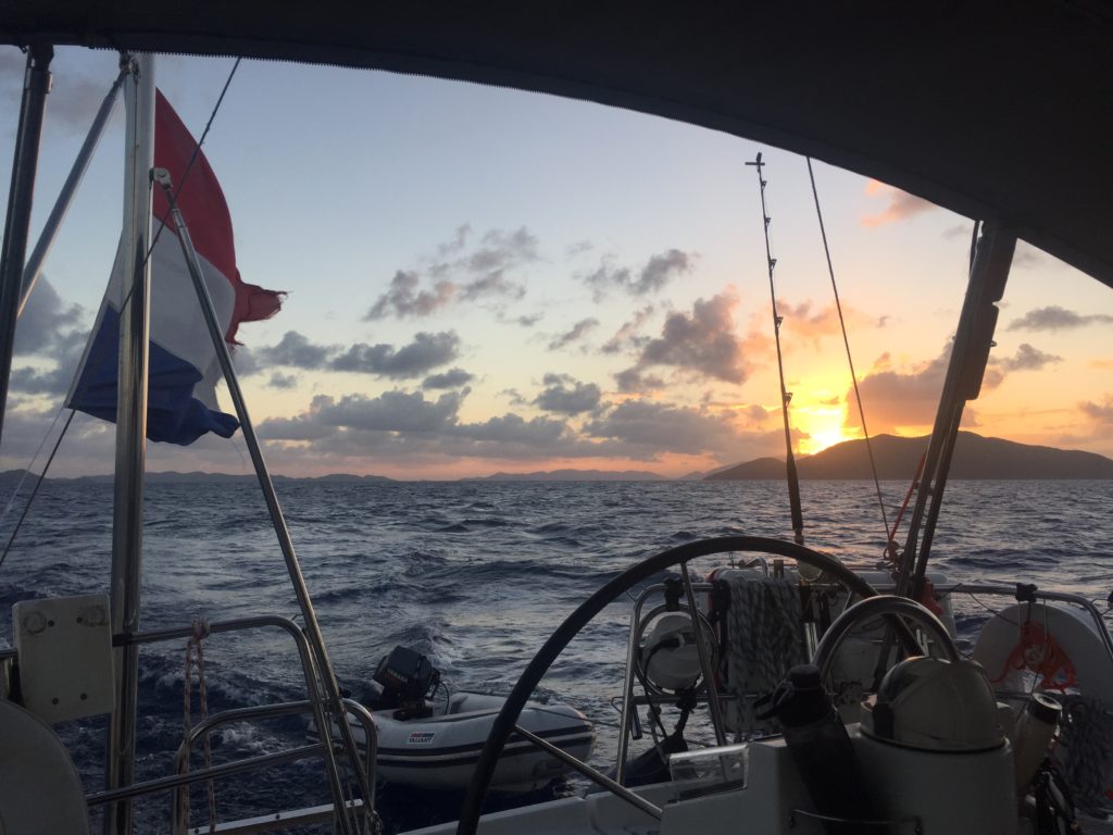 De terugtocht duurt ook weer anderhalf uur en als we weer op de boot terug zijn besluiten we om niet in de depressieve baai van Road Harbour te blijven maar een mooi plekje te zoeken in een van de baaien. We varen naar Spanish Town op Virgin Gorda want van daaruit willen we morgen naar de Baths gaan.Als we aankomen bij Spanish Town vinden we geen plekje waar we rustig kunnen ankeren. Er is hier veel swell en daarom varen we door naar Long Bay waar we de eerste nacht toen we aankwamen op de BVI’s ook hebben gelegen. De afstanden zijn iets groter dan we dachten en we komen pas in het schemer aan.