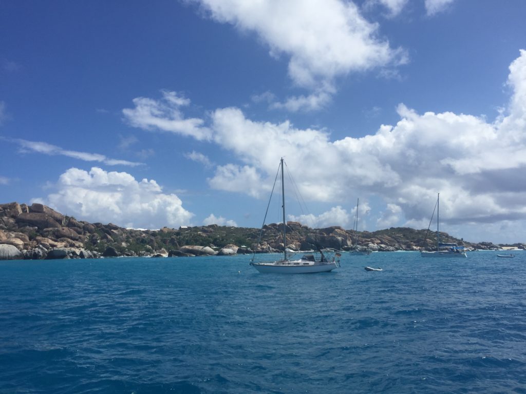 Na de verkwikkende duik van de meiden, gaan we anker op richting de Baths. De Baths is een bijzondere natuurverschijnsel bestaande uit een verzameling granieten rotsblokken die door erosie aan de oppervlakte zijn gekomen. De blokken liggen opgestapeld langs de kust. We zoeken een day mooring omdat je hier niet mag ankeren. De swell is hier ook hoog en dat is geen pretje om met de dinghy naar de kust te gaan en dan zwemmend vanaf de dinghy ankerplek naar de kant te gaan. Omdat het een nationaal park is, mag je hier niet met de dinghy het strand op.