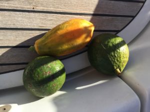 Na de tocht over de Indian River worden we weer terug naar de boot gebracht maar voordat we de rivier uitvaren staat Budah aan de kant met twee grote shoppers vol met fruit uit eigen tuin en een kalebas. Die is niet om te eten maar als we die doorsnijden en het vruchtvlees eruit scheppen. Als je de schaal opschuurt en met citroensap insmeert of lakt, dan houd je een mooie slabak over kom over. Leuk klusje voor later. Als we op de boot aankomen zien we verderop Goodwin voor anker. We spreken af dat ze morgenvanavond bij ons komen eten. Pieter biedt aan om onze jerrycans met drinkwater te vullen, wat we in dank aanvaarden! Het water begon langzamerhand op te raken.