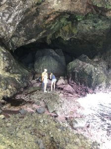 We vertrekken in zijn comfortabele busje en direct als we het dorp uitrijden, wijst hij ons op de vele vruchtbomen en vertelt over de prachtige natuur van Dominica. Het is hier zo mooi! Ons eerste bezoek is aan de woonplaats van zijn schoonouders. Hij rijdt daar even langs op zijn dochter op te halen. Daarna gaan we naar een vleermuizengrot aan de Atlantische kust.