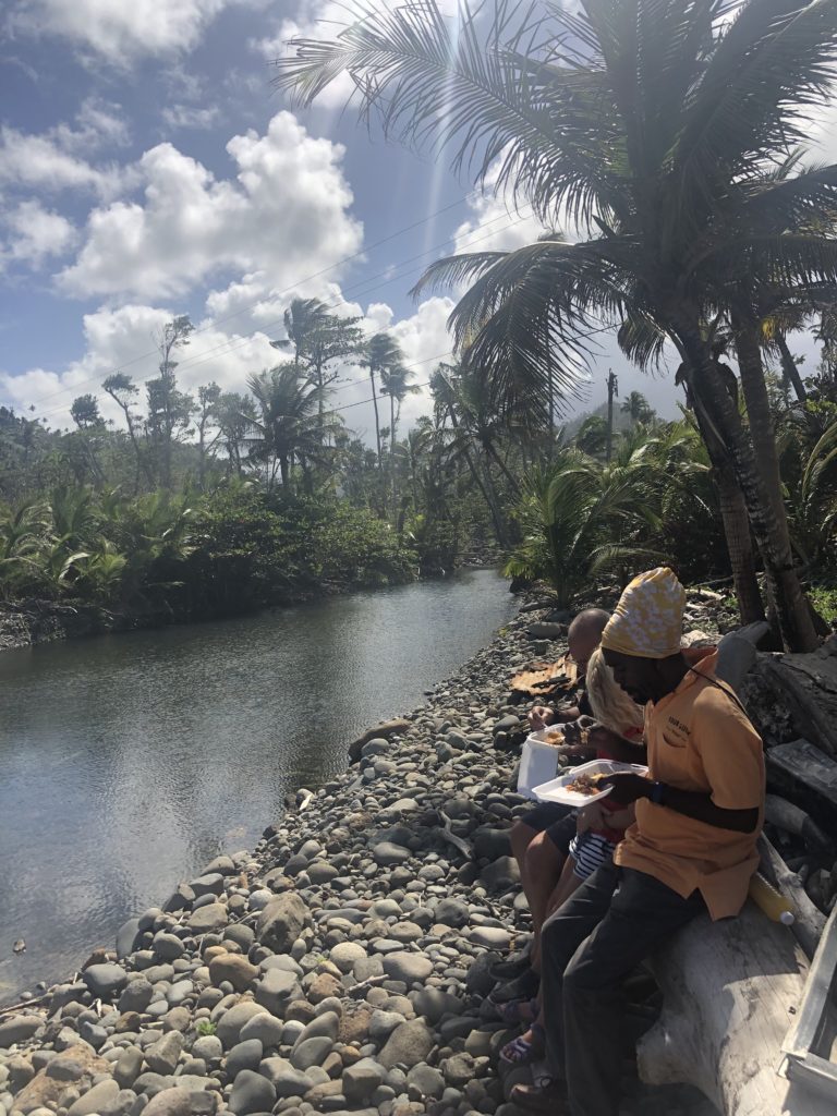 De Creoolse dame heeft heerlijke gerechten en we bestellen hier onze lunch die we meenemen en opeten langs de kant van één van de rivieren van Dominica. Deze mondt uit in de Atlantische oceaan. Wat een uitzicht hebben we. Rechts zien we de stromende rivier, links de oceaan en aan de overkant van de baai zien we een reservaat waar de enige overgebleven Carieb indianen leven.
