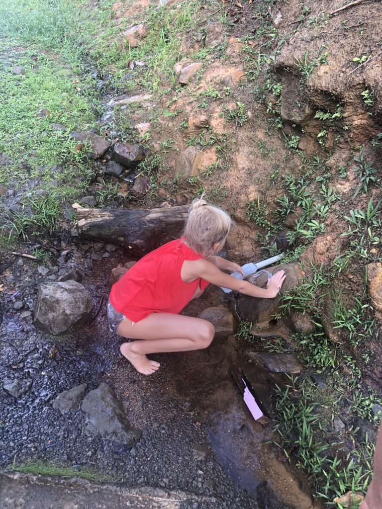 Helaas hebben we geen tijd om daar naar toe te gaan. Want we besluiten om het regenwoud in te gaan, naar één van de watervallen. Maar voordat we daar naar toe rijden, gaan we naar een andere rivier waar de meiden heerlijk kunnen zwemmen en afkoelen. Het is inmiddels zo warm geworden dat even verkoelen in het ijskoude water een genot is.
