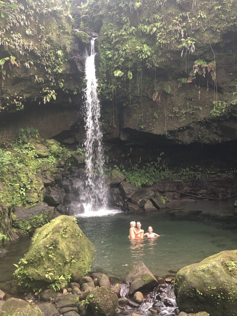 Bij de watervallen is niemand te zien. Mirjam en de meiden hebben hun bikini aan en plonsen in het ijskoude water. Het is heerlijk om zo af te koelen. Sommige plekken op Dominica krijgen op jaarbasis 900 cm water. Vandaar al die rivieren, poeltjes en watervallen.