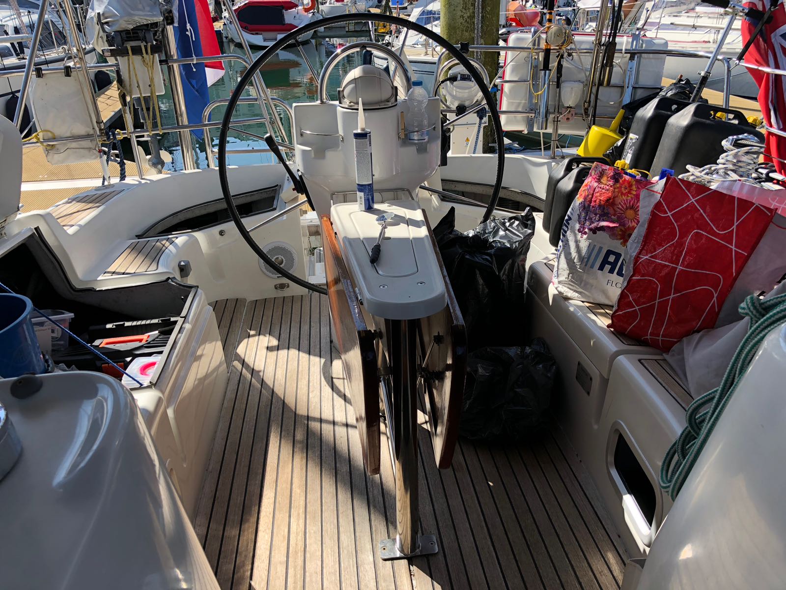Op mijn signaal spuit Harald met de waterslang op de romp en ik zie een klein plekje in het midden waar het licht door de romp schijnt en waar een minuscuul druppeltje water naar binnenkomt. Zou dat het zijn? Kan er na een dag varen zoveel water binnenkomt via zo’n klein gaatje? Het is precies het middelste stuk van de romp waar een doorvoer zit om het water af te voeren. Met behulp van Sikaflex kitten we het dicht. Ook aan de onderkant kitten we Sikaflex en laten het geheel rustig opdrogen. Om de tijd te doden, drinken we een biertje. Als het goed is, is het lek eindelijk boven. De komende tocht zal dat moeten blijken.