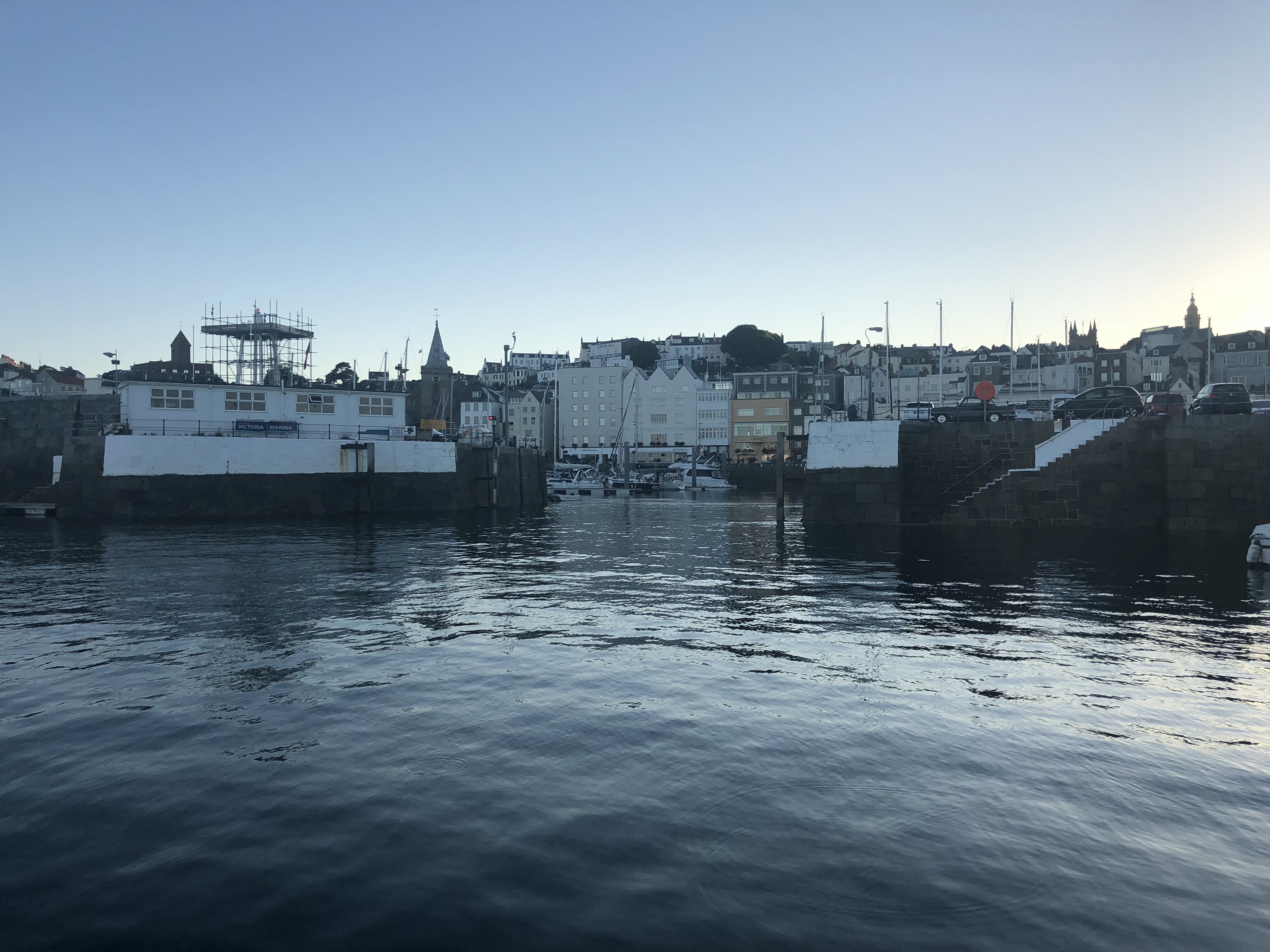 We naderen Guernsey en worden door de stroming meegezogen richting het eiland. We varen de buitenhaven binnen en worden door één van de havenmeesters tegemoet gevaren. Hij vraagt naar onze diepgang. We antwoorden dat we iets minder dan 2 meter steken en hij wijst ons een tijdelijke aanlegplaats aan. De maximaal toelaatbare diepte in deze haven is namelijk 2 meter. Wij steken 2.10 meter dus zouden we eigenlijk verbannen worden naar een achteraf haven. Deze haven is juist zo leuk omdat die in het centrum van Peter Port ligt.