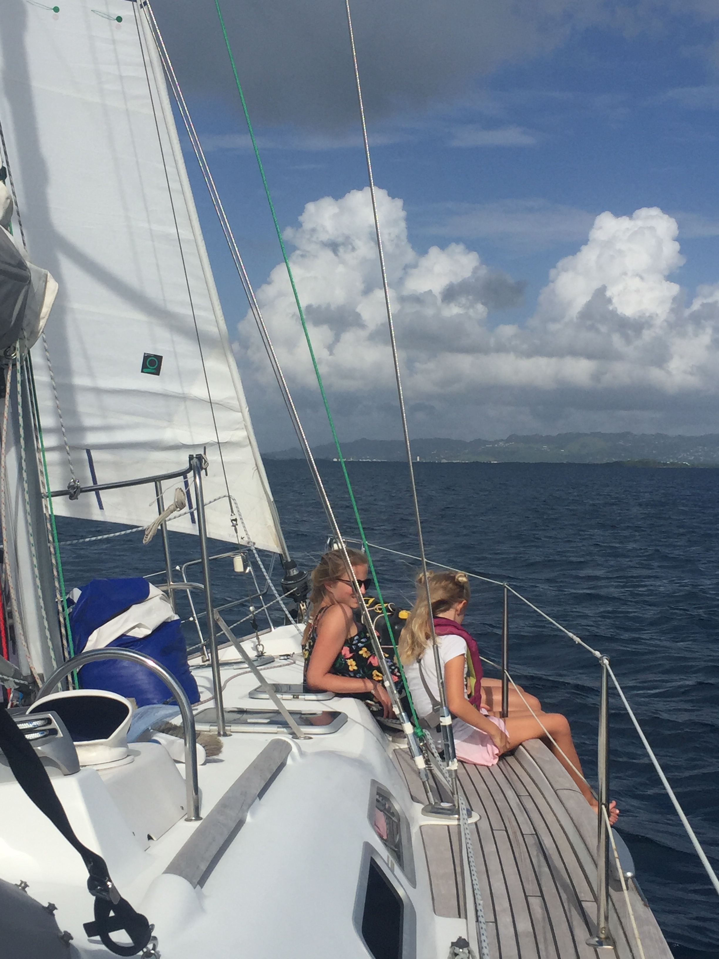 Anse D’arlet is een kleine baai tussen Saint-Anne en Fort-de-France en staat bekend om de schildpadden. De meiden willen daar graag snorkelen. Het is een mooie tocht en er staat weinig wind en nagenoeg geen swell. Langs de kust van Martinique varen we naar onze bestemming. Het is een kleine drie uur varen en onderweg passeren we de Diamant rots. Daar maakt Field Trip nog een mooie foto van Phi.