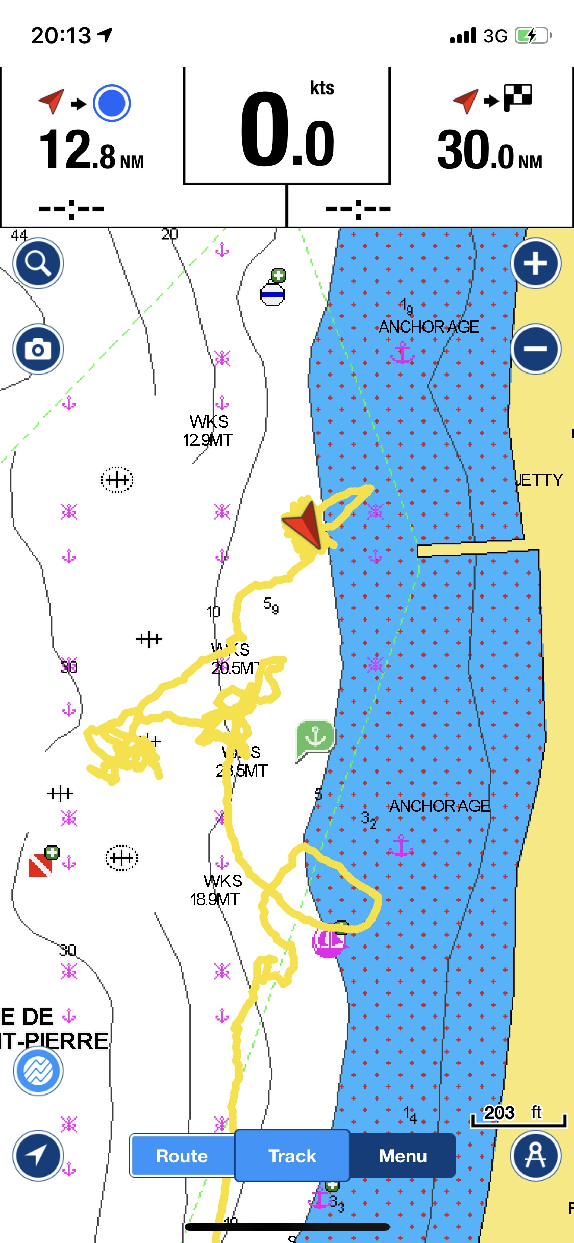 Ik haal de schakelaar over en gelukkig doet de ankerlier het weer. De vierde keer lukt het ons. Het is inmiddels donker maar we hebben we een prachtige plek, maar wel vlak voor de pier waar een paar keer per week een veerboot aanlegt. We nemen het risico en blijven liggen. Als je bodemlijnen bij Saint-Pierre bekijkt, dan is het de eerste 50 meter vanuit de kust maximaal 7 meter diep. Direct daarna gaat het naar 40 meter en vervolgens door naar 200 meter. Eerst een ankerbiertje, want het vele ankeren heeft voor de nodige stress gezorgd, ook bij Noor die zich snel zorgen maakt. Na een warme maaltijd en ons dagelijkse voorleesuurtje uit het prachtige boek ‘Lampje’ gaan we naar bed. We liggen goed en slapen lekker.