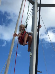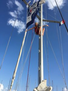 Britt inspecteert boven in de mast nog of alles goed zit en daarna gaan ook Kiki en Noor in het stoeltje naar boven. Maar verder dan de eerste spreader durven ze niet, het is ook zo hoog….