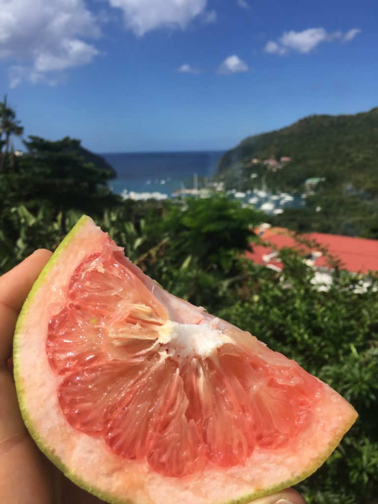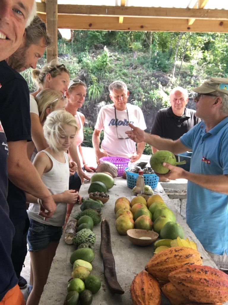 Maar voordat we gaan eten, krijgen we nog een uitleg van Michael over de lokale vruchten van St. Lucia en laat deze zien.