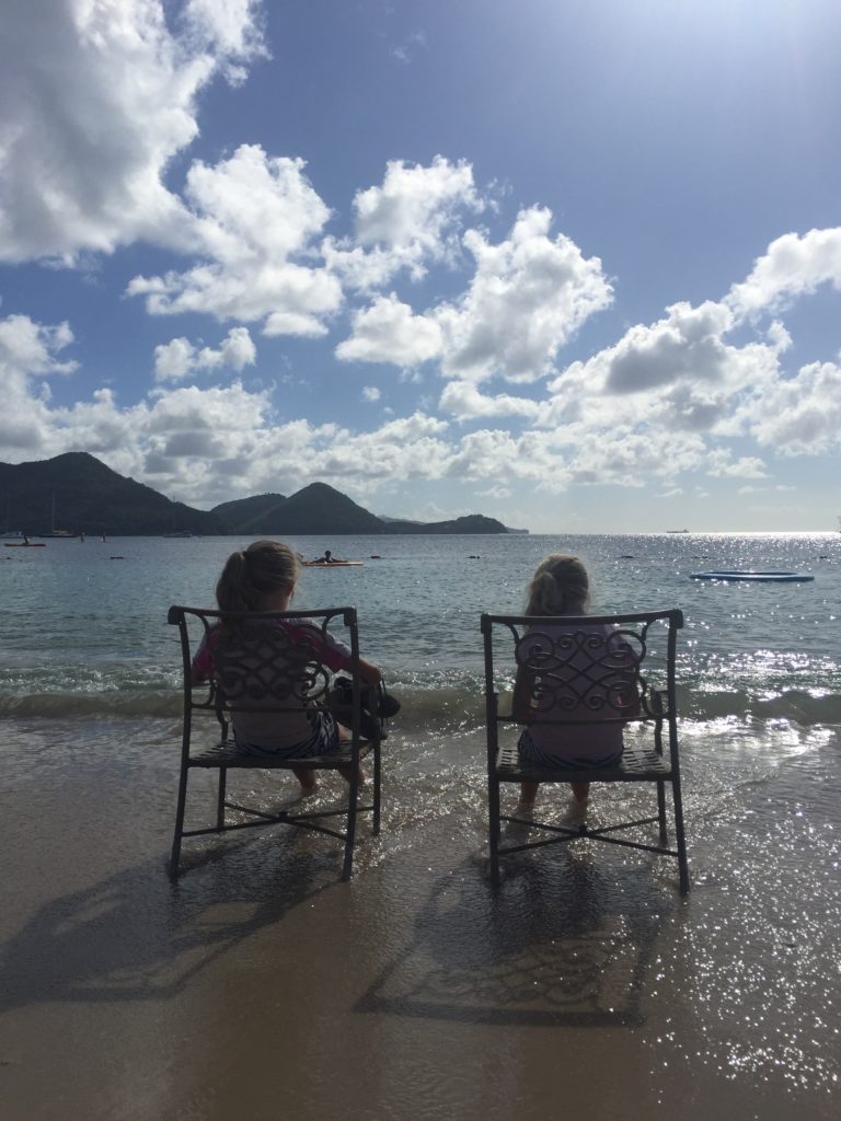 Na de lunch en een plons in de zee rijden we naar het plaatsje Soufriere. Het is er druk met locals die zich op hebben gemaakt voor het weekend om uit te gaan. Wij halen bij een ijsje en eten die op met uitzicht op de baai.
