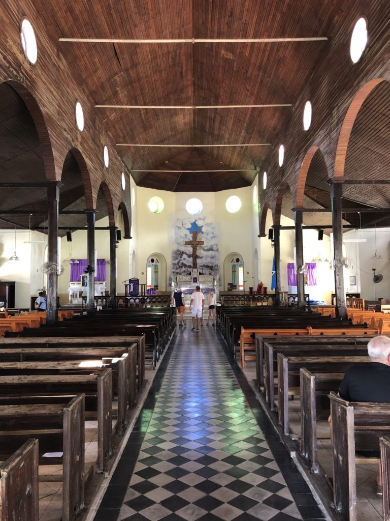 Daarna gaan we naar een kerkje in het dorp waar het plafond vol zit met vleermuizen. De kerk is grotendeels ook open. Geen ramen en er waait een heerlijke frisse wind doorheen. We vervolgen onze weg langs de kust richting Marigot Bay.