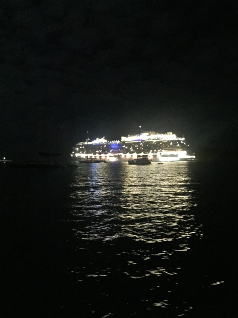 Vol gas worden Mirjam en ik naar Phi gebracht en bij schemer halen we het anker op om ook naar Charlotte Amalia te gaan. Net voor het donker is vinden we een plek in de grote en drukke baai en laten het anker zakken. Daarna varen we alle boodschappen over naar Phi en begint het uitpakken en stouwen. Het is al laat als we klaar zijn en moe en voldaan drinken we samen nog een drankje in de kuip en bewonderen de kerstbomen aan de kade. De cruiseschepen hebben namelijk zoveel licht dat het ’s nachts net een verlichte kerstboom is.