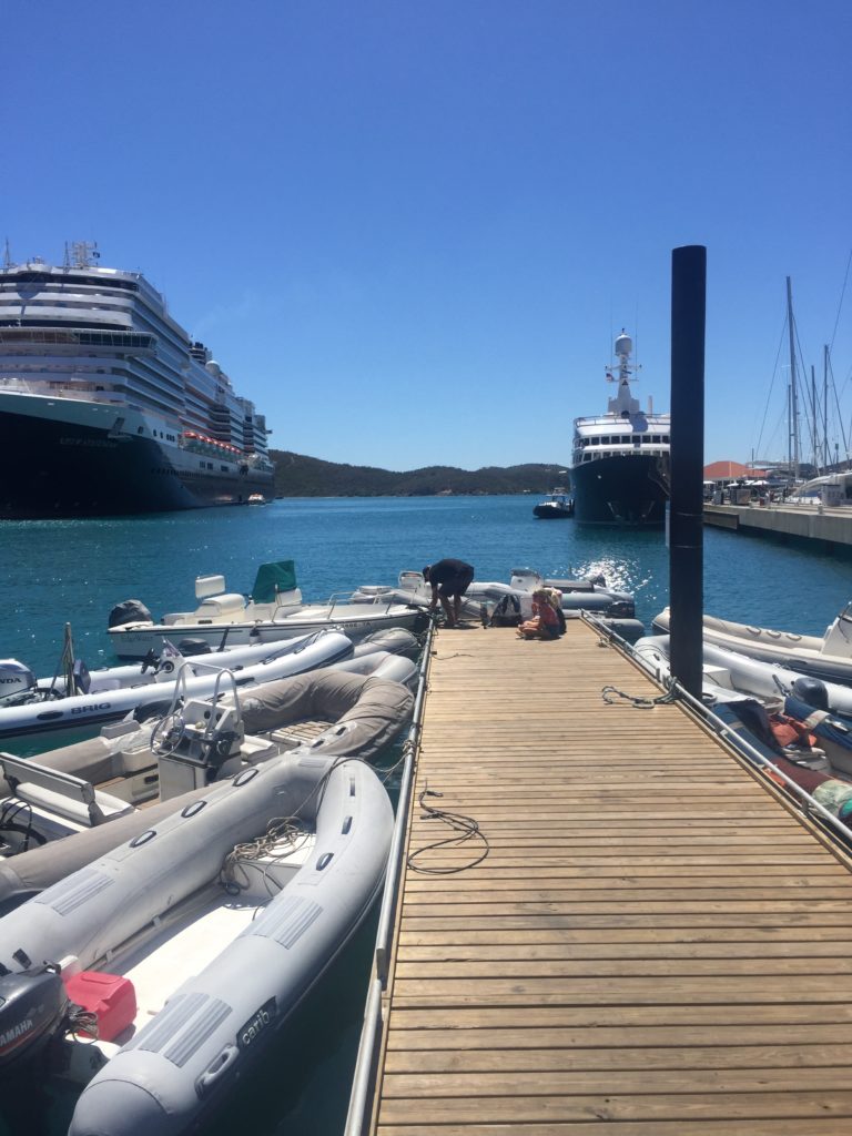 In de hoek van de haven vinden we de dinghydock. Die ligt overvol maar gelukkig vinden we nog een plekje door andere dinghy’s opzij te duwen.