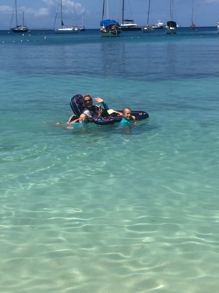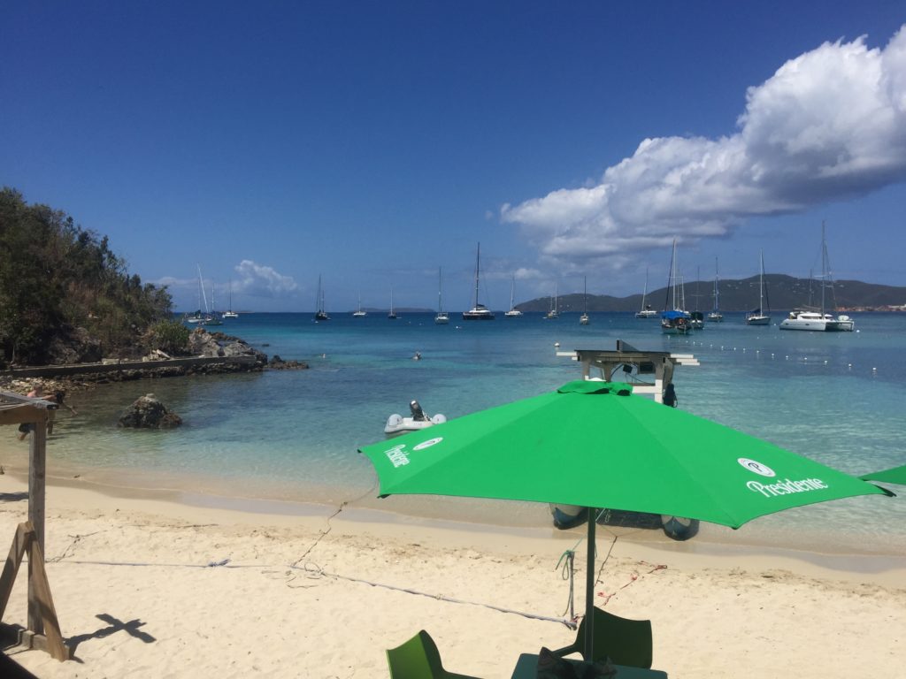 We laten het anker zakken en liggen nagenoeg op dezelfde plek. Gelukkig houdt het anker nu wel in één keer. Mike en Andrea zijn tot de ontdekking gekomen dat ze niet met ons mee kunnen naar Puerto Rico want als zij daar de territoriale wateren binnenvaren zij meteen een belastingaanslag krijgen. Zij hebben de boot in Europa gekocht en moeten de boot nog inklaren in de US. Dat wilden zij doen in Florida omdat het daar gunstiger is. Gelukkig komen ze daar net op tijd achter. Nu moet Mike alleen vandaag naar Puerto Rico vliegen omdat ze daar allerlei spullen naartoe hebben gestuurd. Dus vandaag is Mike op pad, retourtje Puerto Rico. Je kunt het vanaf de baai al zien liggen maar per vliegtuig is de enige optie. Wij hebben een heerlijk relax dagje aan het strand