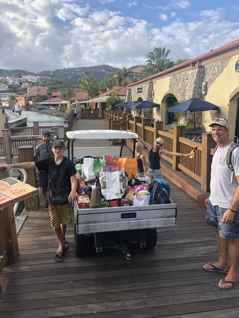 ’s Middags gaan we inkopen doen voor de komende weken. Andrea heeft een goede supermarkt gevonden midden op het eiland. De Pricesmart. Een soort Makro waar alles in grootverpakking wordt aangeboden. Het is wel een stuk rijden maar op St. Thomas rijden safari taxi’s die een vaste route rijden en waar je op en af kunt stappen wanneer je wil. Wij wachten de safari taxi af en rijden naar de Pricesmart. Wat een aanbod heb je daar. Met drie grote volle winkelwagens gaan we naar de kassa. We hebben nog niet alles maar we weten niet hoe we dit al allemaal naar de boot kunnen brengen. Field Trip heeft zelfs nog een winkelwagen meer dan wij. Na het afrekenen wachten we op de safari taxi die we op de heenweg hadden. Hij wilde ons voor een speciaal tarief graag weer ophalen en bij de haven afzetten. Dat komt goed uit met al die boodschappentassen vol. Voordat we de taxi bellen, bestellen we nog met zijn allen een pizza, American size. De meest heerlijke pizza die we ooit gegeten hebben. Na één slize zitten we al vol en nemen de rest in de doos mee. De safari taxi komt voorrijden en we laden alle boodschappen zo goed als het kan in de taxi.