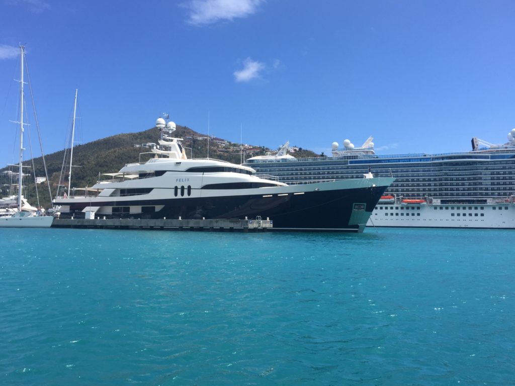 We liggen heerlijk bij Honeymoon Beach in Druif Bay op St. Thomas, maar het wordt tijd om weer te foerageren. We doen dat in Charlotte Amalia dus gaan we anker op naar de drukke Long Bay. Hier meren de grote Cruise schepen af en in de hoek is ook een marina waar meerdere echt grote jachten liggen afgemeerd.