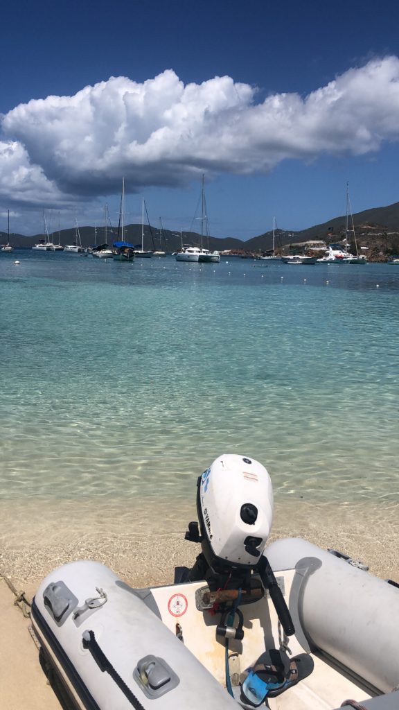 Met zijn allen op de Field Trip en de twee dinghy’s varen we naar de baai van Charlotte Amalia en gaan daar voor anker om vervolgens met de dinghies naar de vaste wal te varen. We gaan op zoek naar de dinghydock en varen de haven in. Omdat onze buitenboordmotor het niet meer doet door de Amerikaanse benzine (vermoed ik), hebben wij de oude motor van Field Trip overgenomen. Een Yamaha 5 PK viertakt.