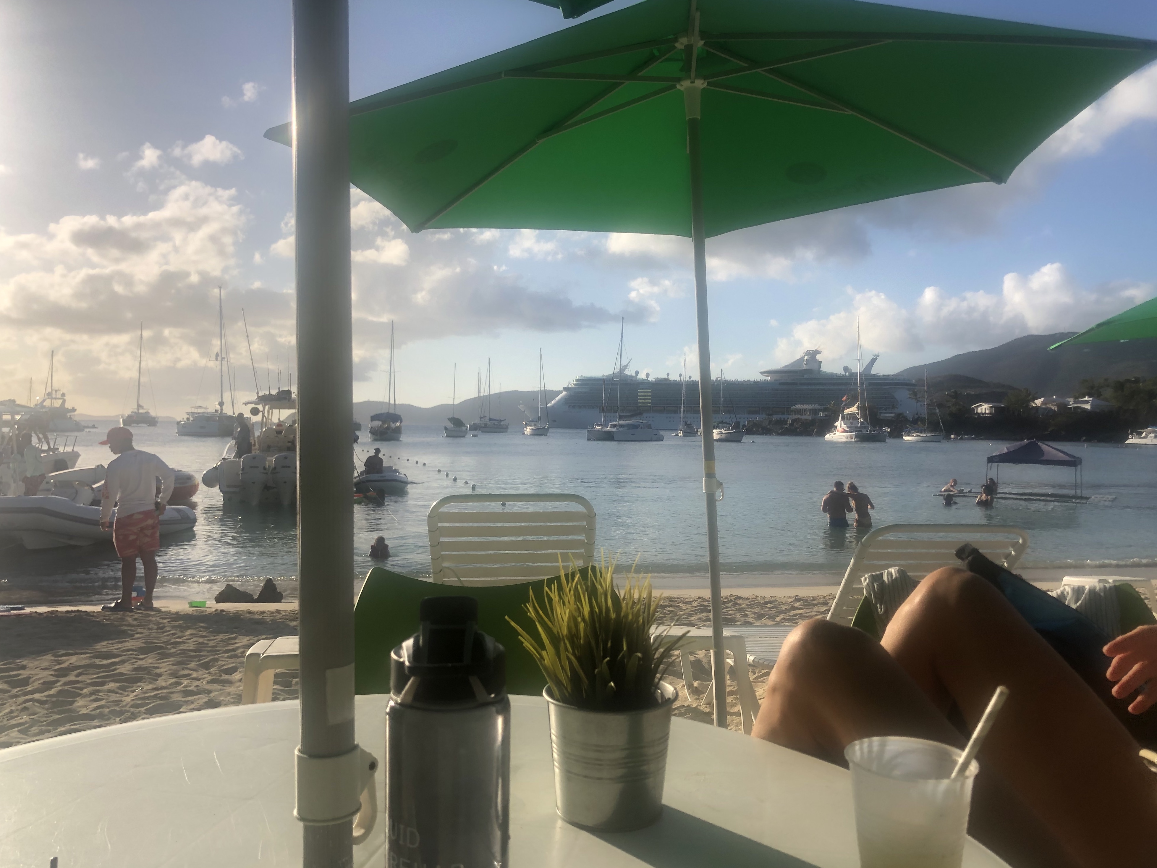 We liggen heerlijk bij Honeymoon Beach in Druif Bay op St. Thomas, maar het wordt tijd om weer te foerageren. We doen dat in Charlotte Amalia dus gaan we anker op naar de drukke Long Bay. Hier meren de grote Cruise schepen af en in de hoek is ook een marina waar meerdere echt grote jachten liggen afgemeerd.